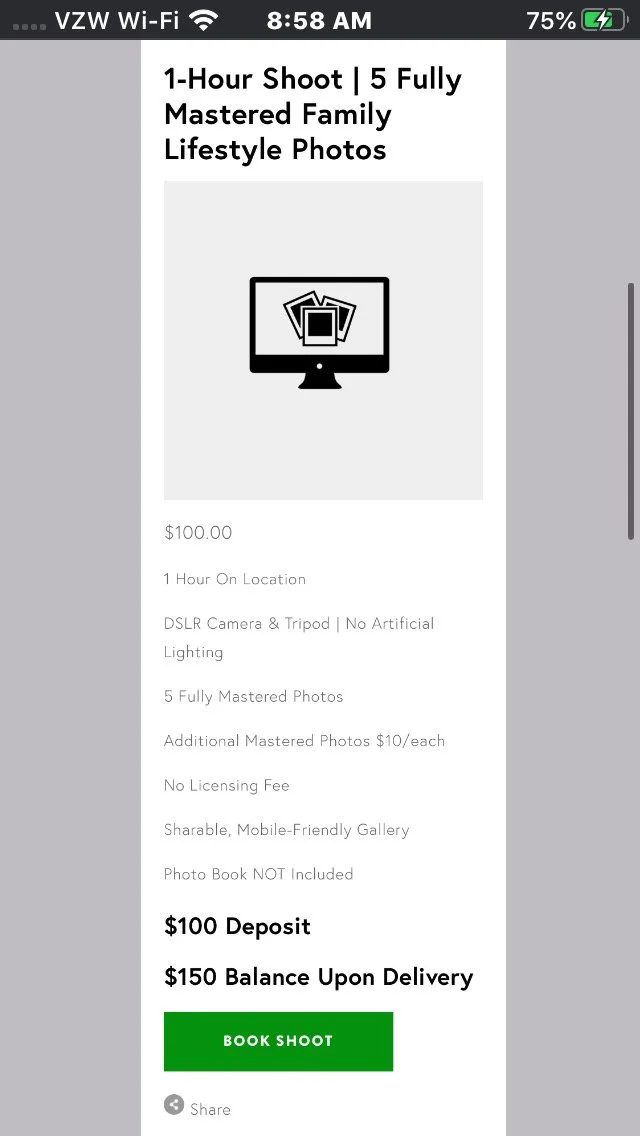 Review the service then click BOOK SHOOT and the shoot will be added to your Shopping Cart. You’ll have a chance to customize everything and ask any questions or make special requests during your checkout process.